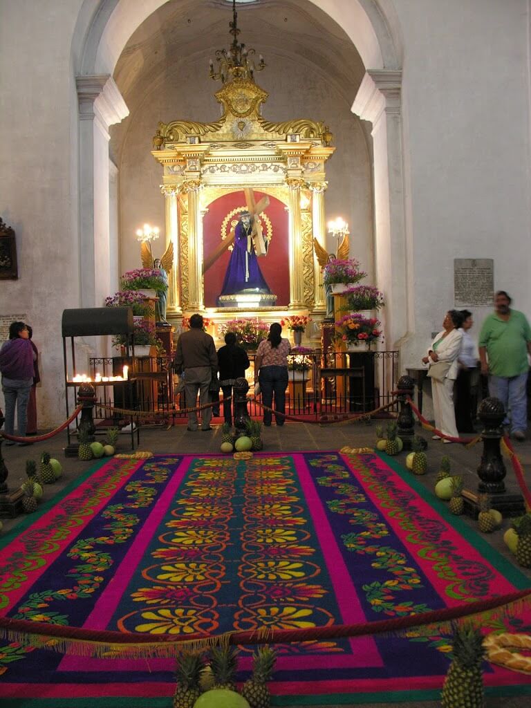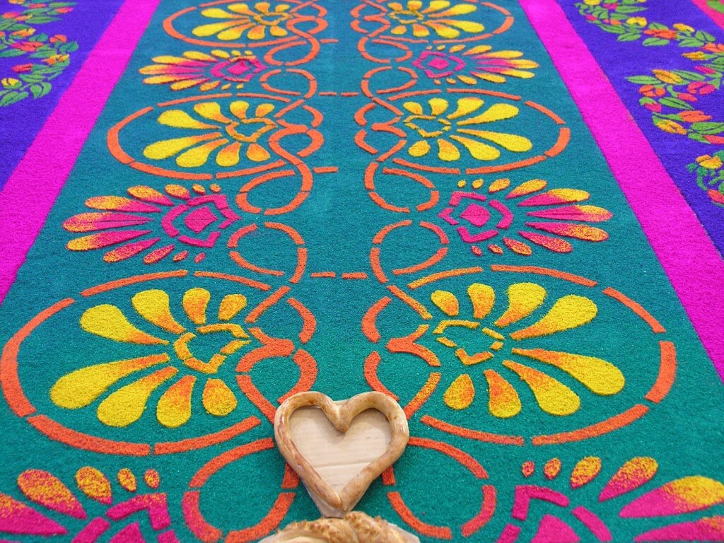 We are here during Lent, and that is visible in different ways – purple banners on buildings, ‘way of the cross’ stations on the square, but the most unique way is a large piece of ‘sand art’ on the floor at the front of several of the churches. The saw dust art is beautiful.